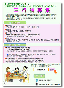 都市化や核家族化など、子育てや家庭教育を支える地域の環境が変化する中、改めて家族の会話やコミュニケーションから育まれるきずなや、家庭のルー ル、「早寝早起き朝ごはん」といった子どもたちの基本的な生活習慣づくりなど、家庭教育の大切さや命の大切さについて、親子や家族で話し合ったり一緒に取 り組むことを社会全体で呼びかけていくため、文部科学省と日本PTA全国協議会は共催により、三行詩コンクールを実施しています。大阪市PTA協議会とい たしましても、この事業の趣旨に賛同し、取り組んでいます。