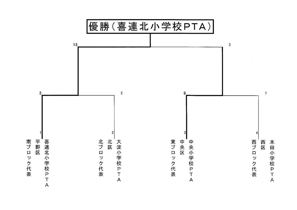 大阪市PTA協議会 お知らせ 2016年12月16日 平成28年度 市P親善ソフトボール大会 【結果】 決勝戦 主 催 : 大阪市PTA協議会 後 援 : 大阪市、大阪市教育委員会、大阪市ソフトボール協会 開催日 : 平成28年11月13日(日) 開会式:9時 試合開始:9時30分 場 所 : くにじまスポーツソフトボール場 (大阪市東淀川区柴島) 結果は以下です。連覇は難しいですねぇ・・・ 【決勝トーナメント結果】 来年もすばらい試合展開を期待してます、各校PTAのみなさんがんばってくださいね♪♪