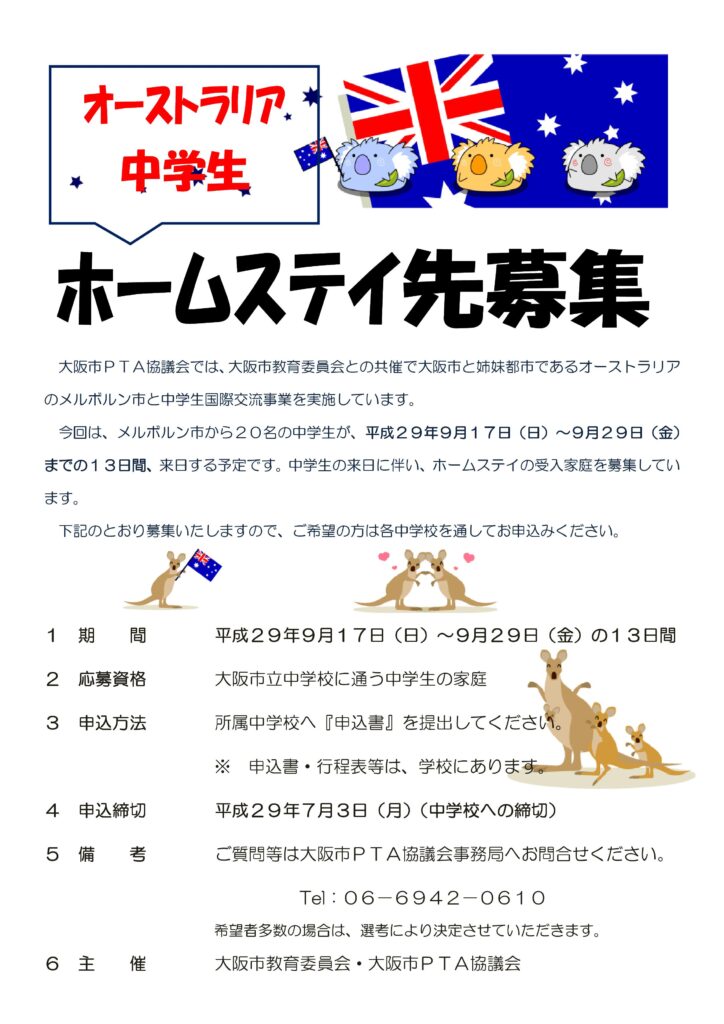 今回は、メルボルン市から20名の中学生が、平成29年9月17日(日)~9月29日(金)までの13日間、来日する予定です。中学生の来日に伴い、ホームステイの受入れ家庭を募集しています。