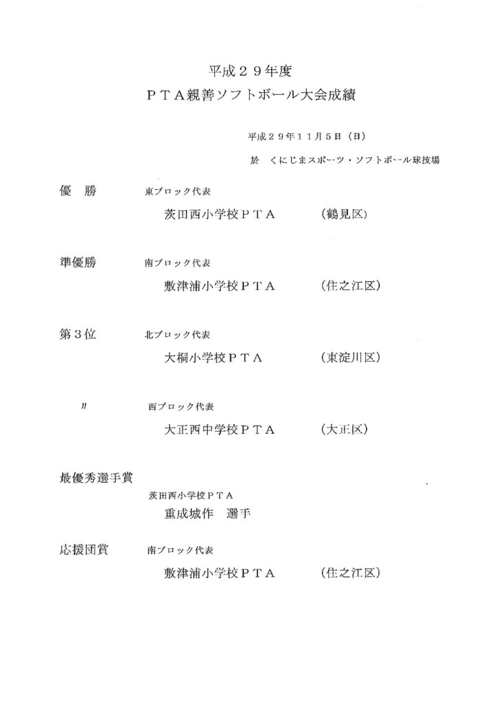 大阪市PTA協議会 お知らせ 2017年11月7日 平成29年度 市P親善ソフトボール大会 【結果】 決勝戦 主 催 : 大阪市PTA協議会 後 援 : 大阪市、大阪市教育委員会、大阪市ソフトボール協会 開催日 : 平成29年11月5日(日) 開会式:9時 試合開始:9時30分 場 所 : くにじまスポーツソフトボール場 (大阪市東淀川区柴島) 【決勝トーナメント結果】 ※大会の様子の写真は追加していきます。 来年もすばらい試合展開を期待してます、各校PTAのみなさんがんばってくださいね♪♪