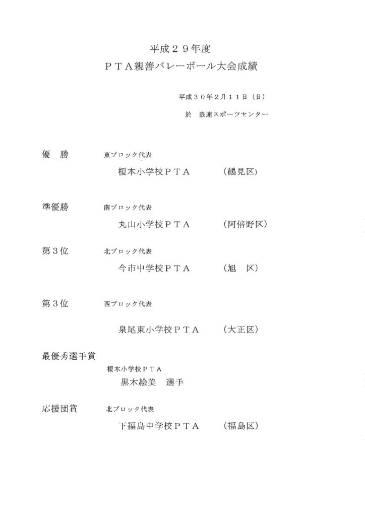 平成29年度 市P親善バレーボール決勝大会 結果