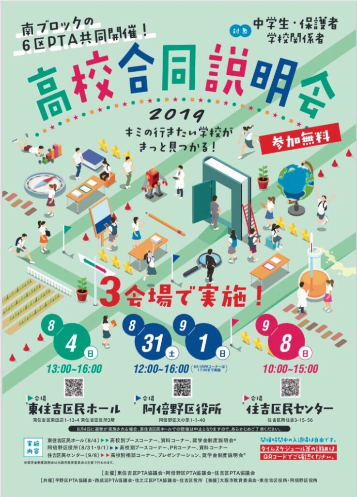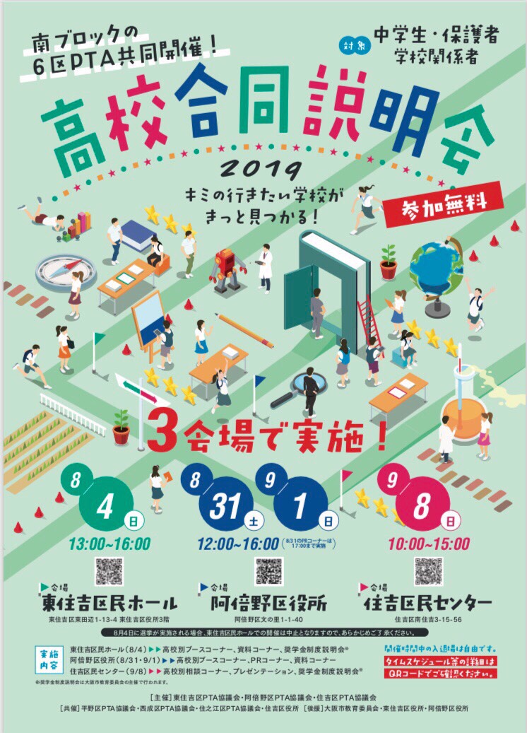 大阪市PTA協議会 お知らせ 2019年7月4日 南ブロック高校合同説明会のお知らせ 大阪市PTA協議会 南ブロック合同での進学説明会のお知らせです。 東住吉区、阿倍野区、住吉区の各PTA協議会主催、 平野区、西成区、住之江区の各PTA協議会の共催にて、6区PTAの共同開催となります。 8月4日(日)午後1時から午後4時まで、東住吉区民ホールにて、 8月31日(土) 9月1日(日)正午から午後4時まで、阿倍野区役所にて、 9月8日(日)午前10時から午後3時まで、各実施いたします。 詳細は以下のポスターをご覧ください。