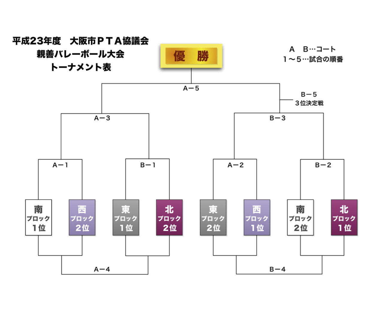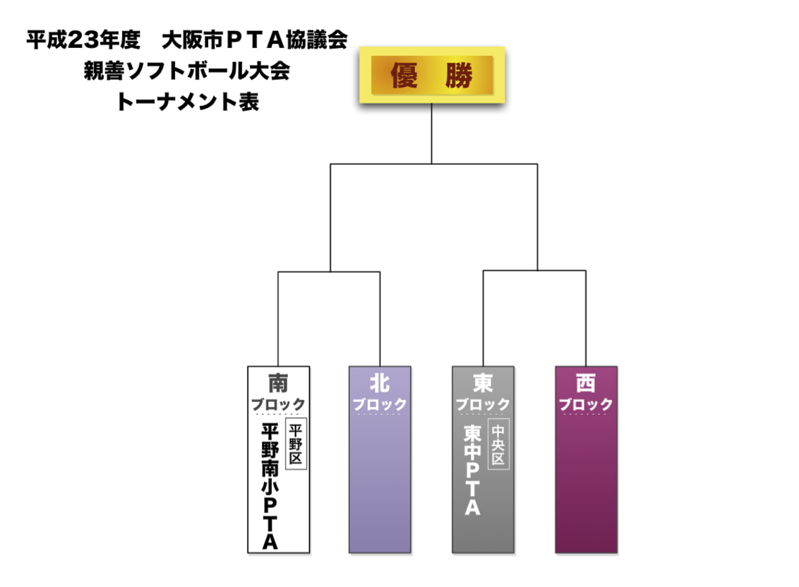 平成23年度の大阪市PTA協議会「親善ソフトボール大会」「親善バレーボール大会」の決勝大会トーナメント表です。